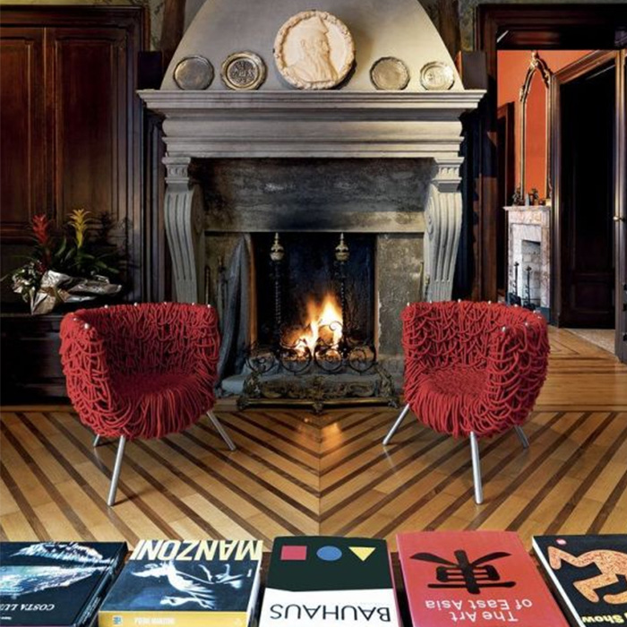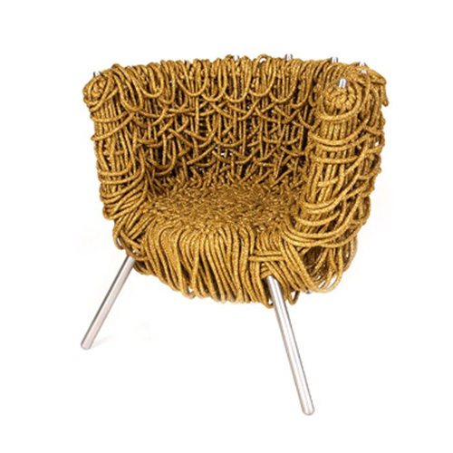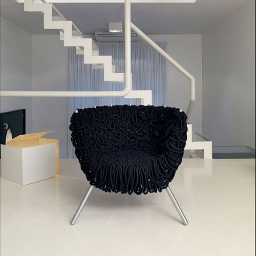 Wrap-around fauteuil met stalen frame. Innovatieve stoel, gecreëerd door de overlapping van honderden draaiingen van ongeveer vijfhonderd meter speciaal touw met acryl kern, op het basisframe.
