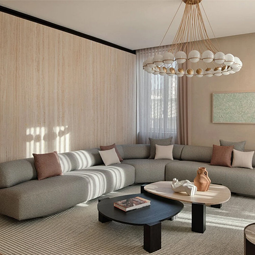 De Gogan-collectie wordt vervolmaakt door salontafels in verschillende maten, die natuurlijke vormen oproepen en, net als de bank, worden gekenmerkt door de verstevigingen van de structuur. Het ontwerp van de salontafel, een comfortabel meubelaccessoire bij een bank of fauteuil, doet denken aan stenen gebeeldhouwd door wind en water: stevig en toch zacht tegelijk.