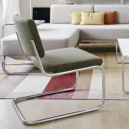Deze fauteuil heeft uitstekende eigenschappen: hij is elegant, tijdloos en heeft een hoog zitcomfort. Bovendien is hij licht zoals alleen een sledestoel kan zijn. De eerste stoelen die in de jaren ‚20 van de vorige eeuw van stalen buizen werden gemaakt, waren nog nauwelijks gestoffeerd. In de Thonet-catalogus uit 1935 stond echter al een hele reeks volumineus gestoffeerde fauteuils en banken. Deze serie is waarschijnlijk ingeluid door de S 411, een eigen ontwerp uit 1932. Tegenwoordig is de fauteuil voorzien van een hoogwaardige stoffering met binnenvering. Er is een bijpassende voetenbank leverbaar.
